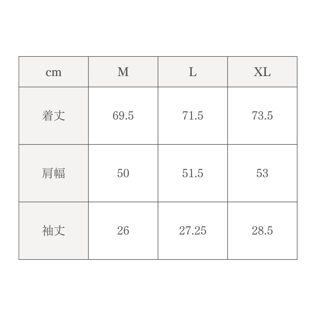 XLサイズ:着丈73.5cm/肩幅53cm/袖丈28.5cm